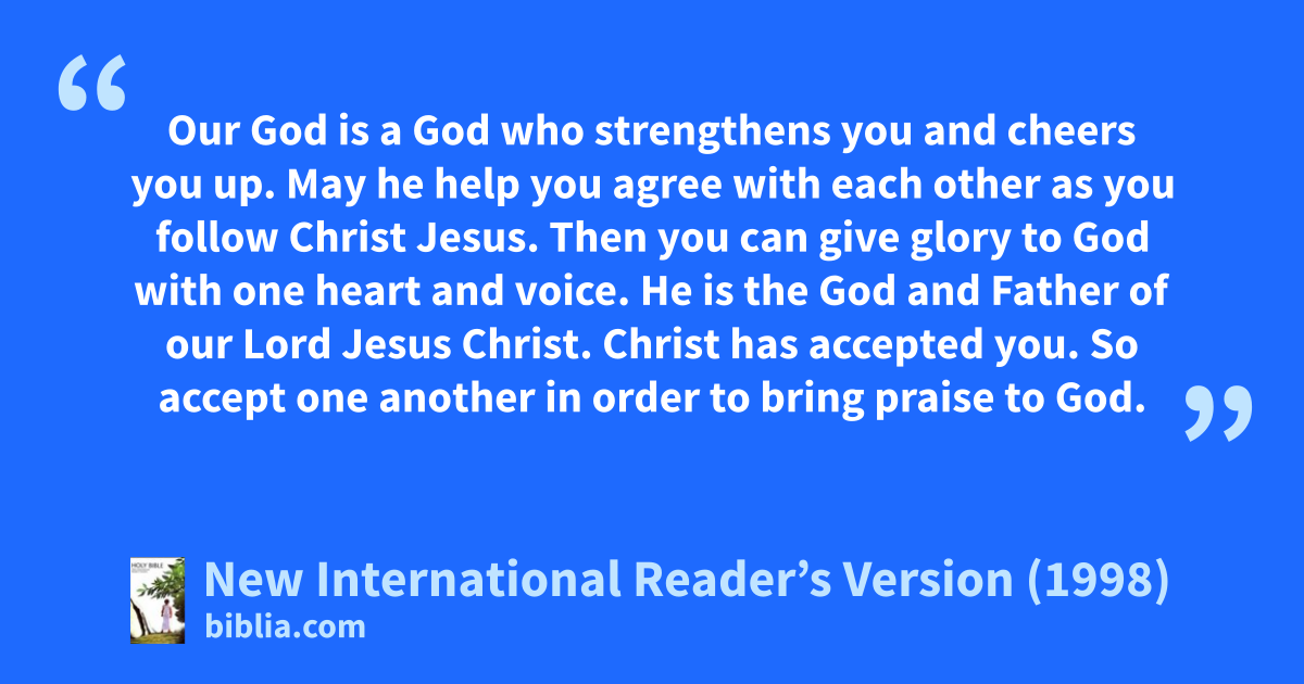5Our God is a God who strengthens you and cheers you up. May he help you agree with each other as you follow Christ Jesus. 6Then you can give glory to God with one heart and voice. He is the God and Father of our Lord Jesus Christ.
