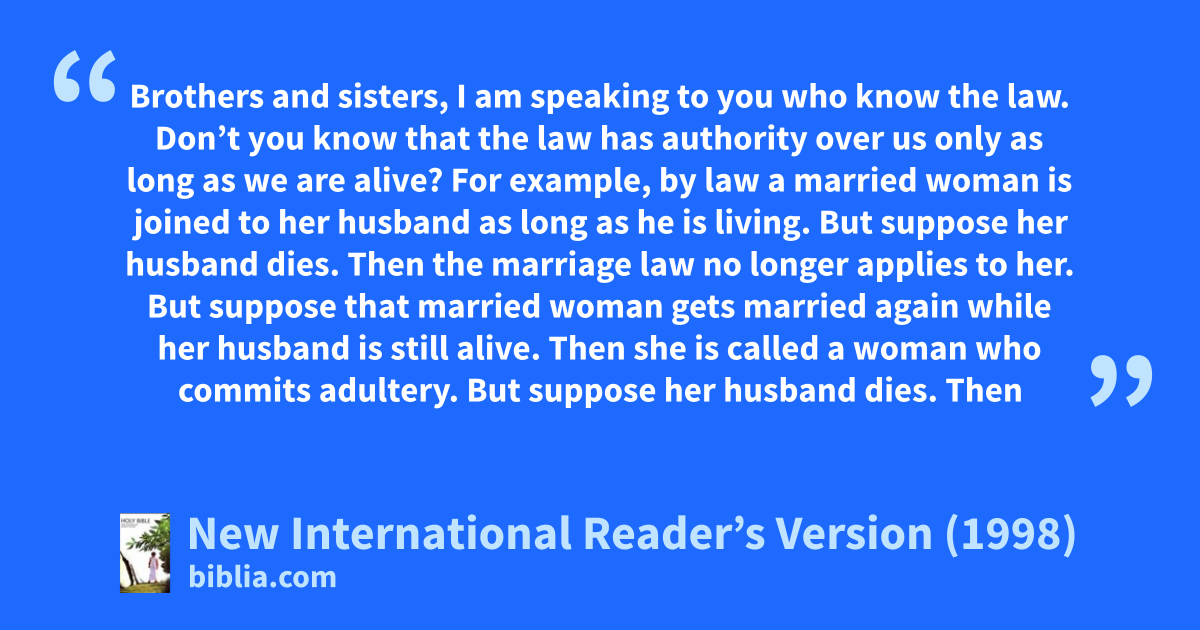 7 Brothers and sisters, I am speaking to you who know the law. Don’t you know that the law has authority over us only as long as we are alive? 2For example, by law a married woman is joined to her husband as long as he is living. But suppose her husband dies. Then the marriage law no longer applies to her. 3But suppose that married woman gets married again while her husband is still alive. Then she is called a woman who commits adultery. But suppose her husband dies. Then she is free from that law. She is not guilty of adultery even if she marries another man.