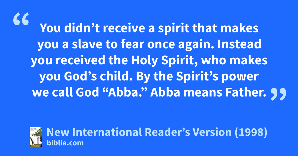14Those who are led by the Spirit of God are children of God. 15You didn’t receive a spirit that makes you a slave to fear once again. Instead you received the Holy Spirit, who makes you God’s child. By the Spirit’s power we call God “Abba.” Abba means Father. 16The Spirit himself joins with our spirits. Together they give witness that we are God’s children.