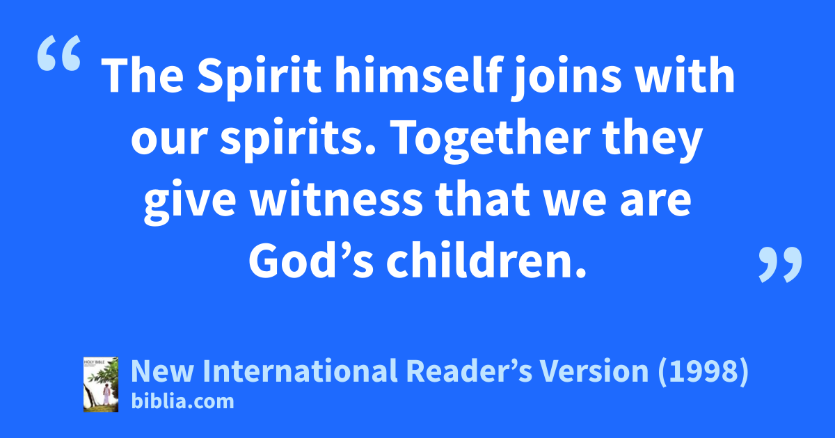 14Those who are led by the Spirit of God are children of God. 15You didn’t receive a spirit that makes you a slave to fear once again. Instead you received the Holy Spirit, who makes you God’s child. By the Spirit’s power we call God “Abba.” Abba means Father. 16The Spirit himself joins with our spirits. Together they give witness that we are God’s children.