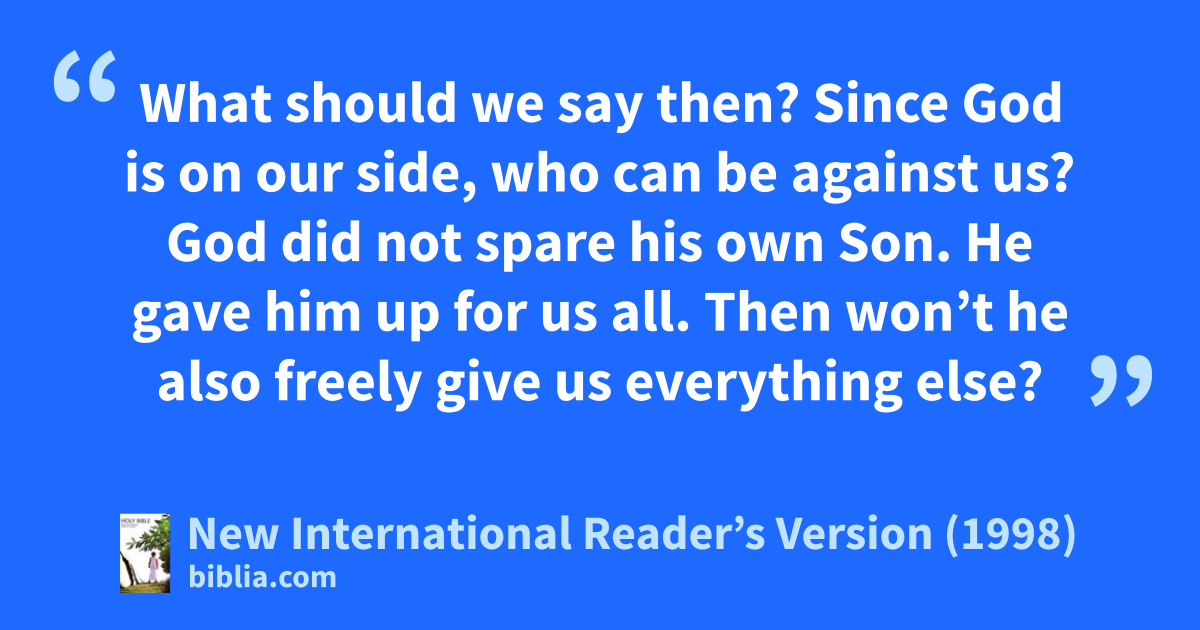 31What should we say then? Since God is on our side, who can be against us? 32God did not spare his own Son. He gave him up for us all. Then won’t he also freely give us everything else?
