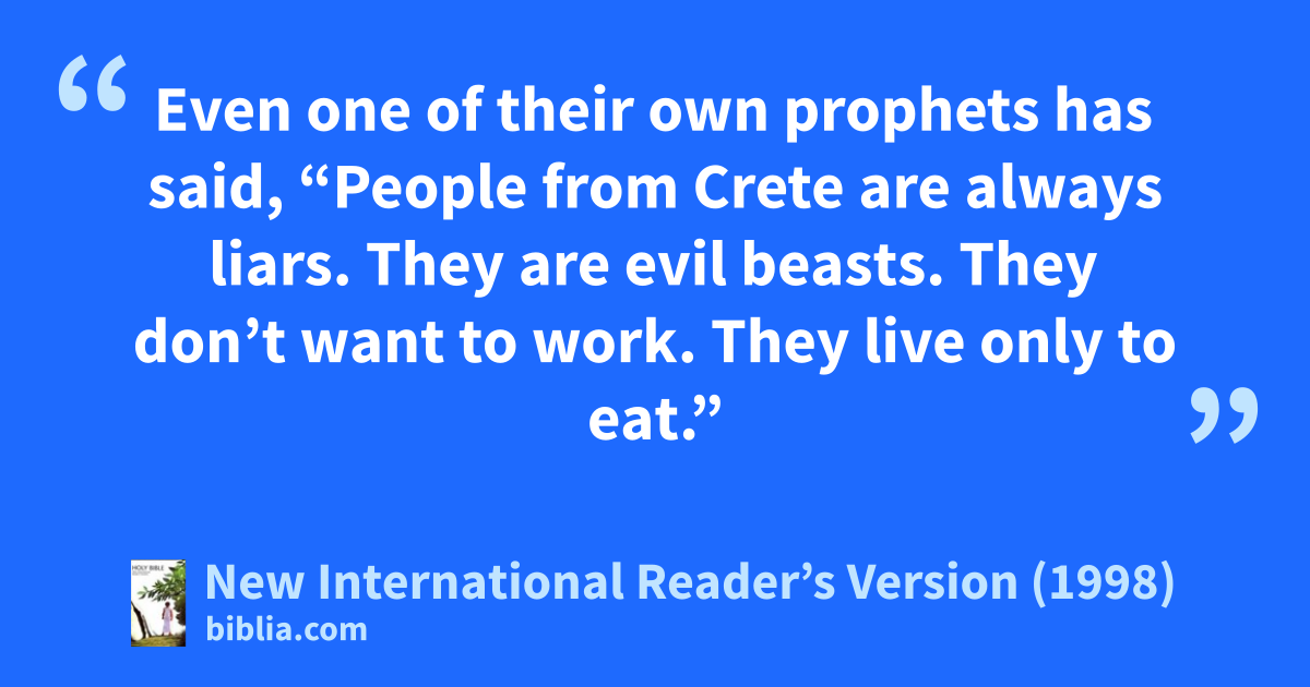 12Even one of their own prophets has said, “People from Crete are always liars. They are evil beasts. They don’t want to work. They live only to eat.” 13What I have just said is true. So give them a strong warning. Then they will understand the faith correctly. 14They will pay no attention to Jewish stories that aren’t completely true. They won’t listen to the commands of those who turn away from the truth.
