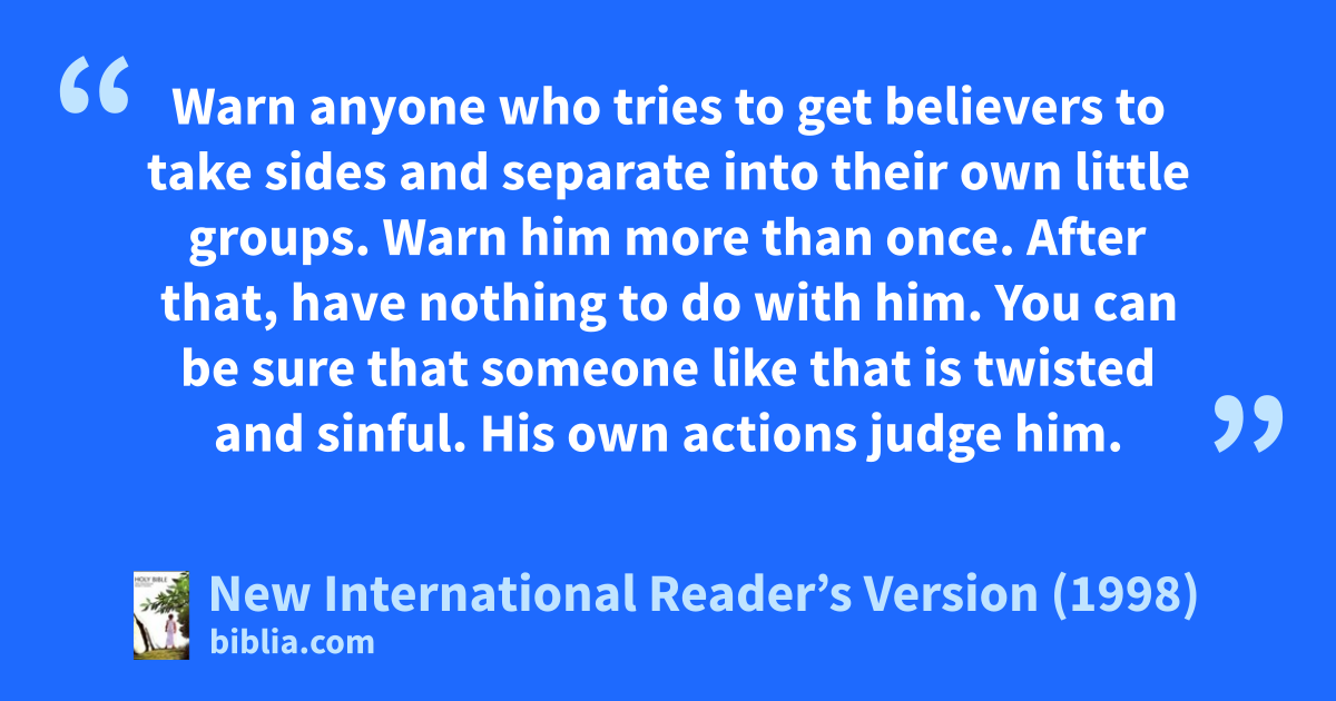 10Warn anyone who tries to get believers to take sides and separate into their own little groups. Warn him more than once. After that, have nothing to do with him. 11You can be sure that someone like that is twisted and sinful. His own actions judge him.