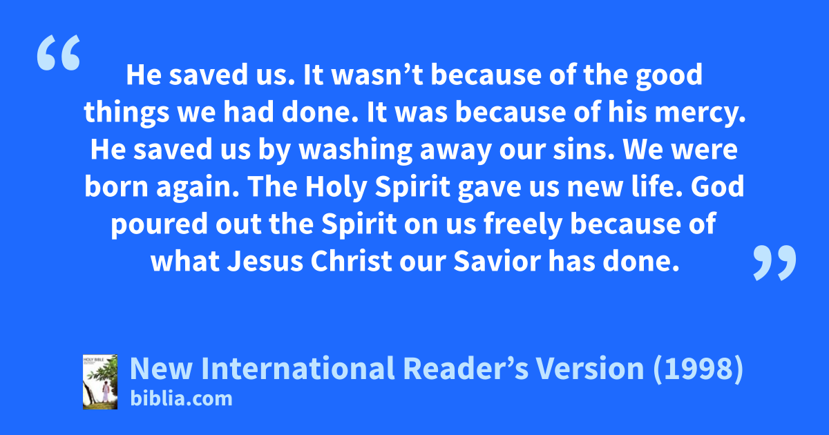 4But the kindness and love of God our Savior appeared. 5He saved us. It wasn’t because of the good things we had done. It was because of his mercy. He saved us by washing away our sins. We were born again. The Holy Spirit gave us new life.