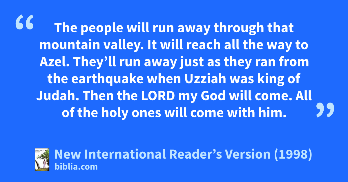 4On that day he will stand on the Mount of Olives. It’s east of Jerusalem. It will be split in two from east to west. Half of the mountain will move north. The other half will move south. A large valley will be formed. 5The people will run away through that mountain valley. It will reach all the way to Azel. They’ll run away just as they ran from the earthquake when Uzziah was king of Judah. Then the Lord my God will come. All of the holy ones will come with him.
