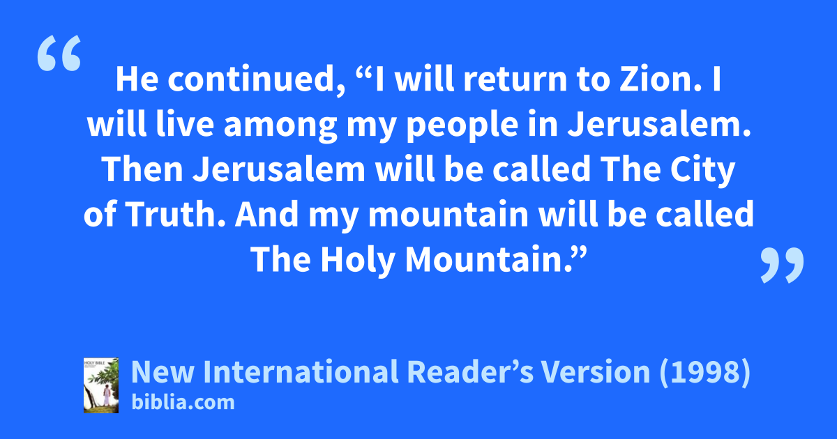 3He continued, “I will return to Zion. I will live among my people in Jerusalem. Then Jerusalem will be called The City of Truth. And my mountain will be called The Holy Mountain.”