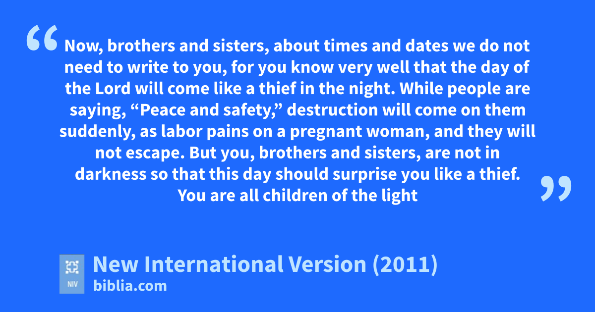 5 Now, brothers and sisters, about times and datesg we do not need to write to you,h 2 for you know very well that the day of the Lordi will come like a thief in the night.j 3 While people are saying, “Peace and safety,”k destruction will come on them suddenly,l as labor pains on a pregnant woman, and they will not escape.m
