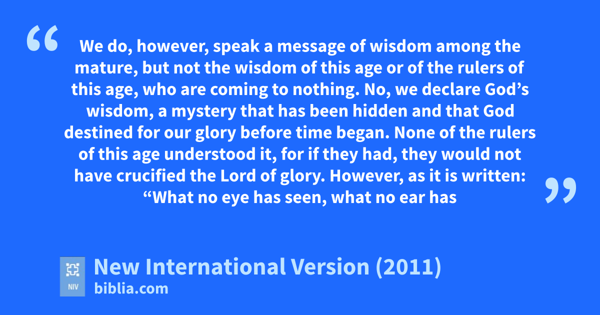 6 We do, however, speak a message of wisdom among the mature,u but not the wisdom of this agev or of the rulers of this age, who are coming to nothing.w 7 No, we declare God’s wisdom, a mysteryx that has been hiddeny and that God destined for our glory before time began. 8 None of the rulers of this agez understood it, for if they had, they would not have crucified the Lord of glory.a 9 However, as it is written:
