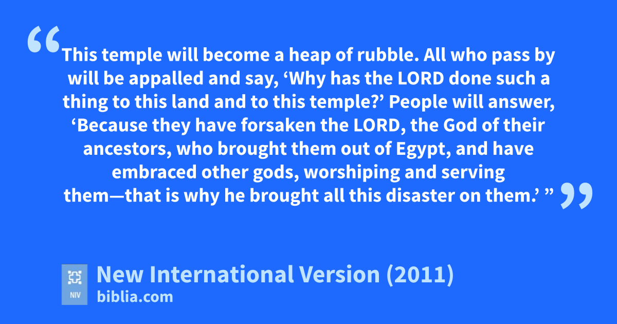 19 “But if youa turn awayb and forsakec the decrees and commands I have given youb and go off to serve other gods and worship them, 20 then I will uprootd Israel from my land,e which I have given them, and will reject this temple I have consecrated for my Name. I will make it a byword and an object of ridiculef among all peoples. 21 This temple will become a heap of rubble. Allc who pass by will be appalledg and say,h ‘Why has the Lord done such a thing to this land and to this temple?’ 22 People will answer, ‘Because they have forsaken the Lord, the God of their ancestors, who brought them out of Egypt, and have embraced other gods, worshiping and serving themi—that is why he brought all this disaster on them.’ ”