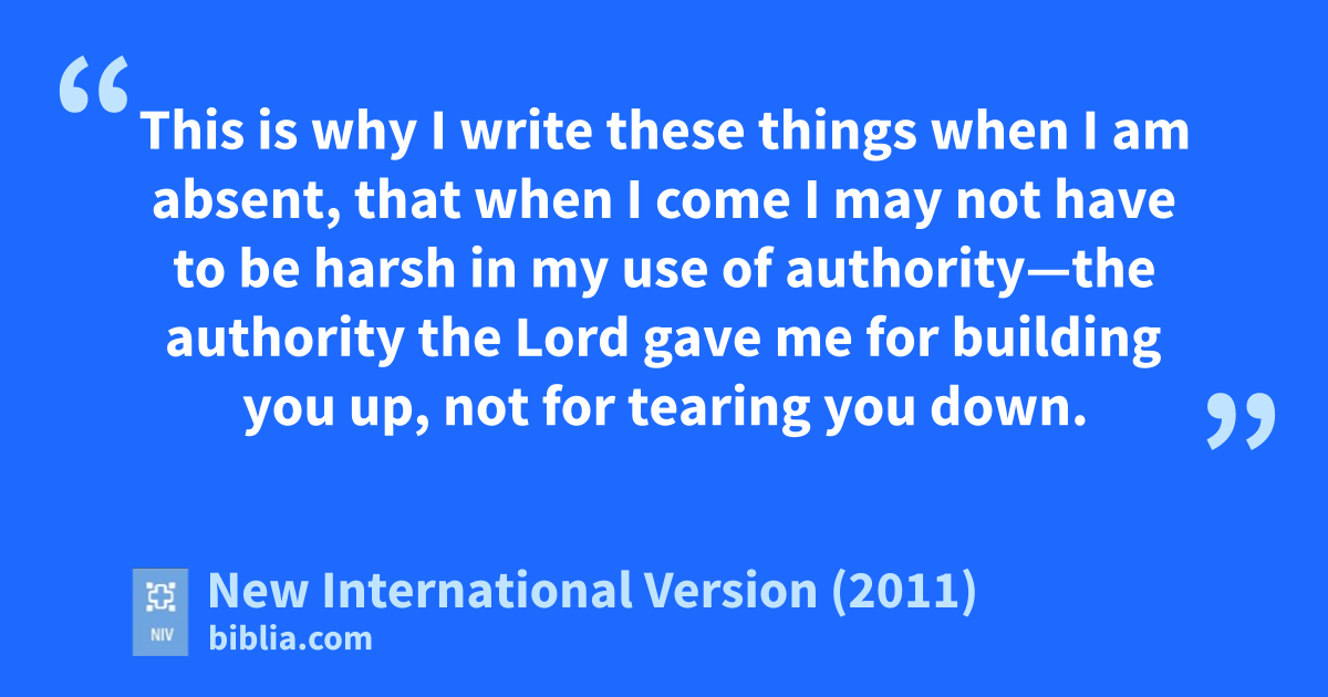 5 Examine yourselvesb to see whether you are in the faith; test yourselves.c Do you not realize that Christ Jesus is in youd—unless, of course, you fail the test? 6 And I trust that you will discover that we have not failed the test. 7 Now we pray to God that you will not do anything wrong—not so that people will see that we have stood the test but so that you will do what is right even though we may seem to have failed. 8 For we cannot do anything against the truth, but only for the truth. 9 We are glad whenever we are weake but you are strong;f and our prayer is that you may be fully restored.g 10 This is why I write these things when I am absent, that when I come I may not have to be harshh in my use of authority—the authority the Lord gave me for building you up, not for tearing you down.i