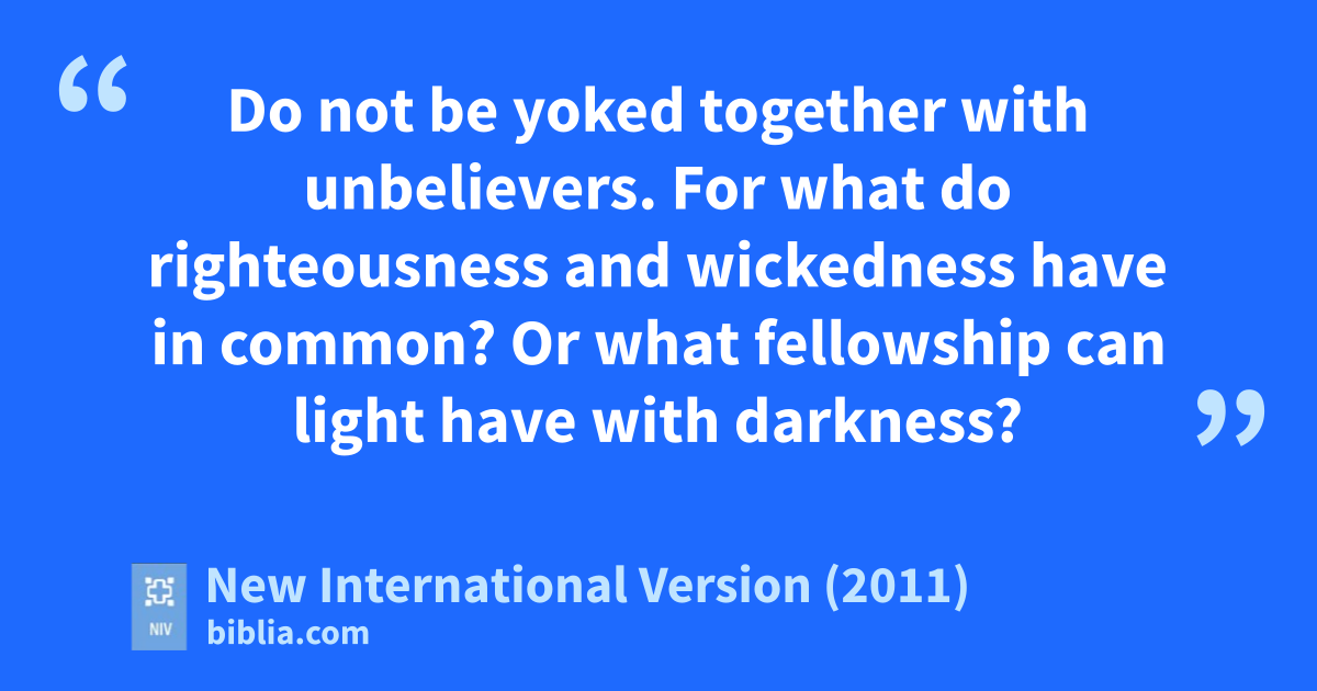 14 Do not be yoked togetheru with unbelievers.v For what do righteousness and wickedness have in common? Or what fellowship can light have with darkness?w 15 What harmony is there between Christ and Belialb?x Or what does a believery have in common with an unbeliever?z 16 What agreement is there between the temple of God and idols?a For we are the templeb of the living God.c As God has said: