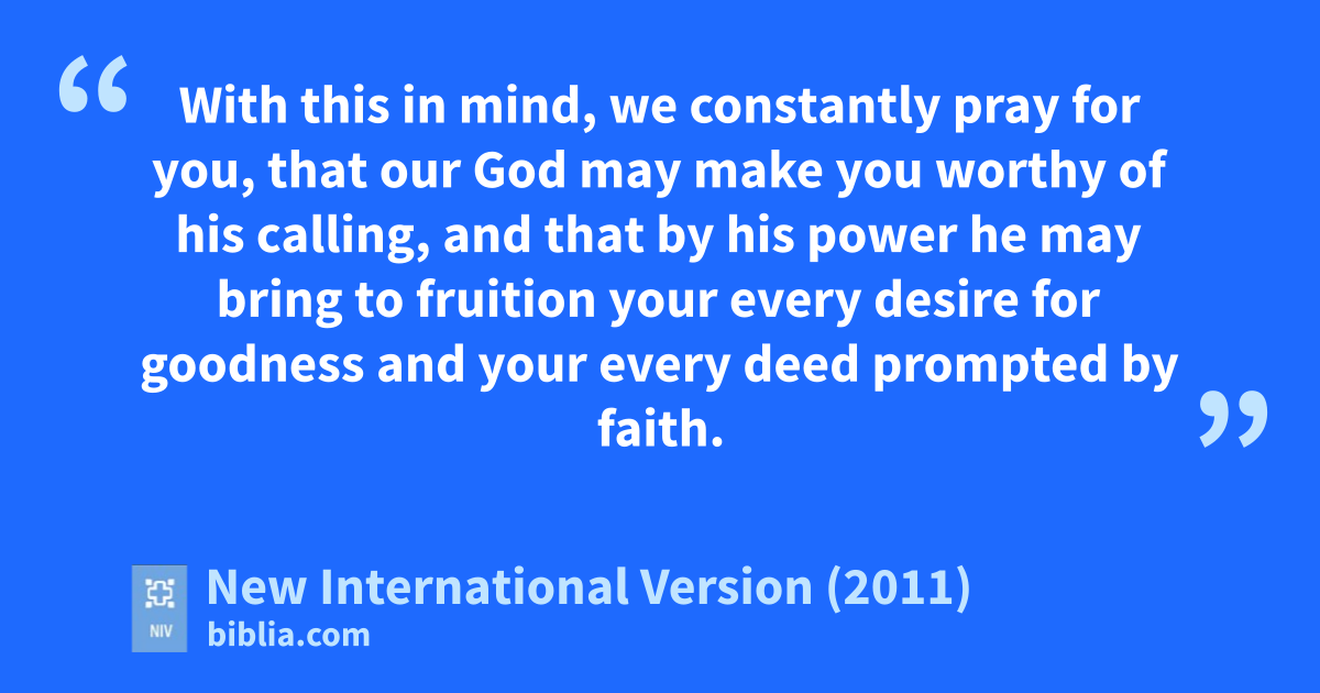 11 With this in mind, we constantly pray for you,z that our God may make you worthya of his calling,b and that by his power he may bring to fruition your every desire for goodnessc and your every deed prompted by faith.d 12 We pray this so that the name of our Lord Jesus may be glorified in you,e and you in him, according to the grace of our God and the Lord Jesus Christ.c