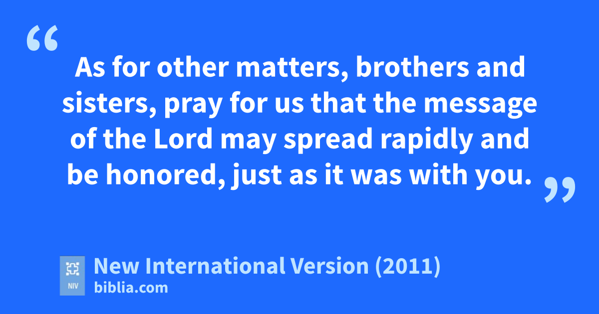 3 As for other matters, brothers and sisters,p pray for usq that the message of the Lordr may spread rapidly and be honored, just as it was with you.s 2 And pray that we may be delivered from wicked and evil people,t for not everyone has faith. 3 But the Lord is faithful,u and he will strengthen you and protect you from the evil one.v 4 We have confidencew in the Lord that you are doing and will continue to do the things we command. 5 May the Lord direct your heartsx into God’s love and Christ’s perseverance.