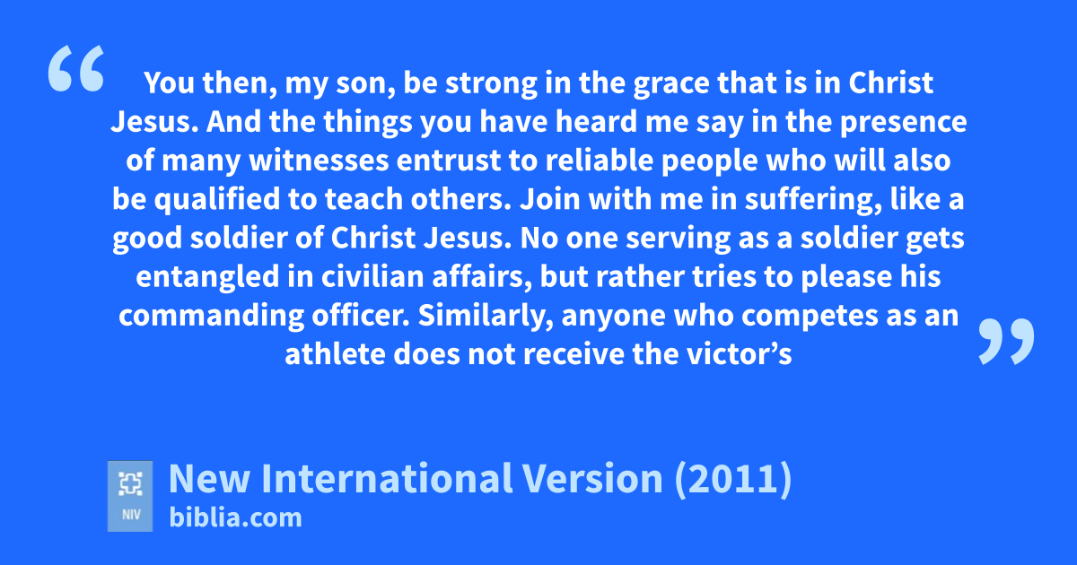 2 You then, my son,u be strongv in the grace that is in Christ Jesus. 2 And the things you have heard me sayw in the presence of many witnessesx entrust to reliable people who will also be qualified to teach others. 3 Join with me in suffering,y like a good soldierz of Christ Jesus. 4 No one serving as a soldier gets entangled in civilian affairs, but rather tries to please his commanding officer. 5 Similarly, anyone who competes as an athlete does not receive the victor’s crowna except by competing according to the rules. 6 The hardworking farmer should be the first to receive a share of the crops.b 7 Reflect on what I am saying, for the Lord will give you insight into all this.