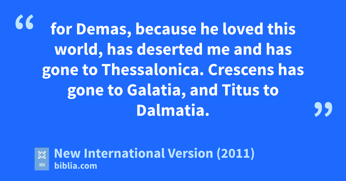 9 Do your best to come to me quickly,l 10 for Demas,m because he loved this world,n has deserted me and has gone to Thessalonica.o Crescens has gone to Galatia,p and Titusq to Dalmatia. 11 Only Luker is with me.s Get Markt and bring him with you, because he is helpful to me in my ministry. 12 I sent Tychicusu to Ephesus.v 13 When you come, bring the cloak that I left with Carpus at Troas,w and my scrolls, especially the parchments.