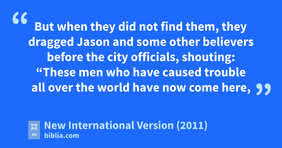 5 But other Jews were jealous; so they rounded up some bad characters from the marketplace, formed a mob and started a riot in the city.h They rushed to Jason’si house in search of Paul and Silas in order to bring them out to the crowd.a 6 But when they did not find them, they draggedj Jason and some other believersk before the city officials, shouting: “These men who have caused trouble all over the worldl have now come here,m 7 and Jason has welcomed them into his house. They are all defying Caesar’s decrees, saying that there is another king, one called Jesus.”n 8 When they heard this, the crowd and the city officials were thrown into turmoil. 9 Then they made Jasono and the others post bond and let them go.