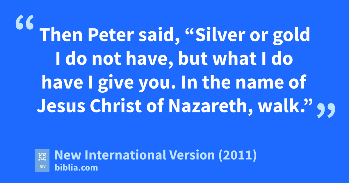 6 Then Peter said, “Silver or gold I do not have, but what I do have I give you. In the name of Jesus Christ of Nazareth,n walk.” 7 Taking him by the right hand, he helped him up, and instantly the man’s feet and ankles became strong. 8 He jumped to his feet and began to walk. Then he went with them into the temple courts, walking and jumping,o and praising God. 9 When all the peoplep saw him walking and praising God, 10 they recognized him as the same man who used to sit begging at the temple gate called Beautiful,q and they were filled with wonder and amazement at what had happened to him.