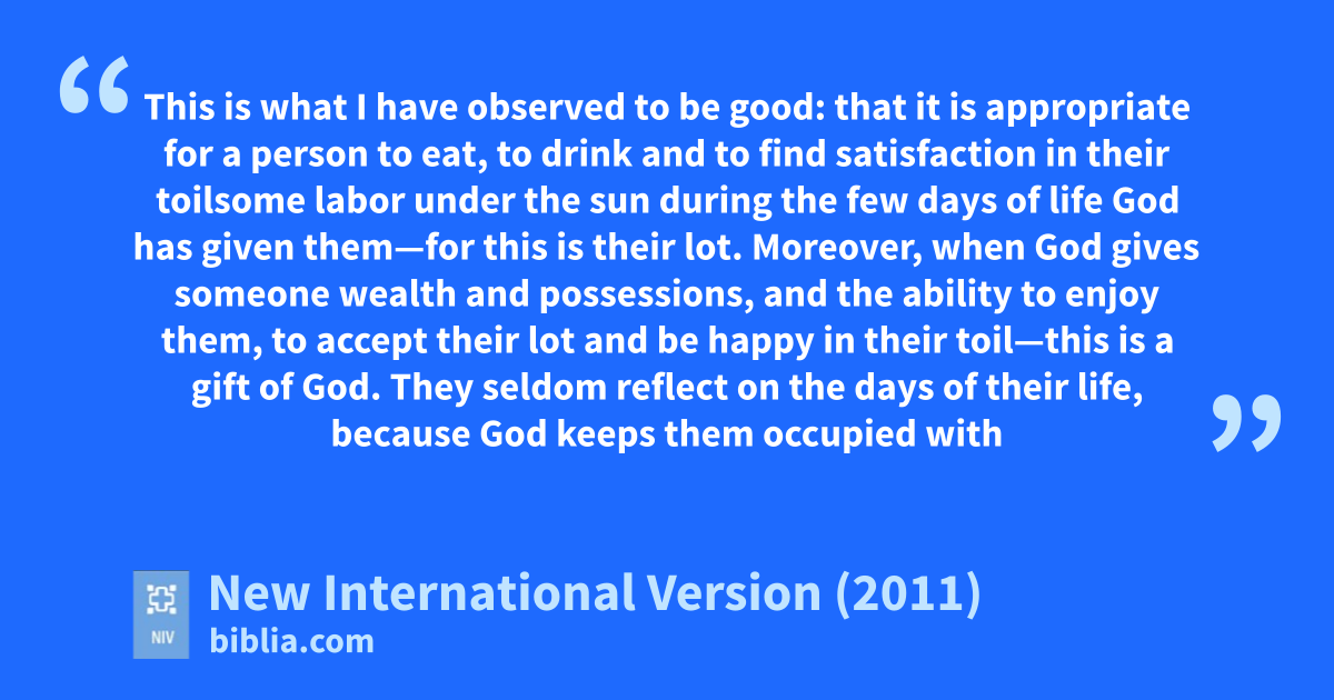 18 This is what I have observed to be good: that it is appropriate for a person to eat, to drinkc and to find satisfaction in their toilsome labord under the sun during the few days of life God has given them—for this is their lot. 19 Moreover, when God gives someone wealth and possessions,e and the ability to enjoy them,f to accept their lotg and be happy in their toil—this is a gift of God.h 20 They seldom reflect on the days of their life, because God keeps them occupied with gladness of heart.i