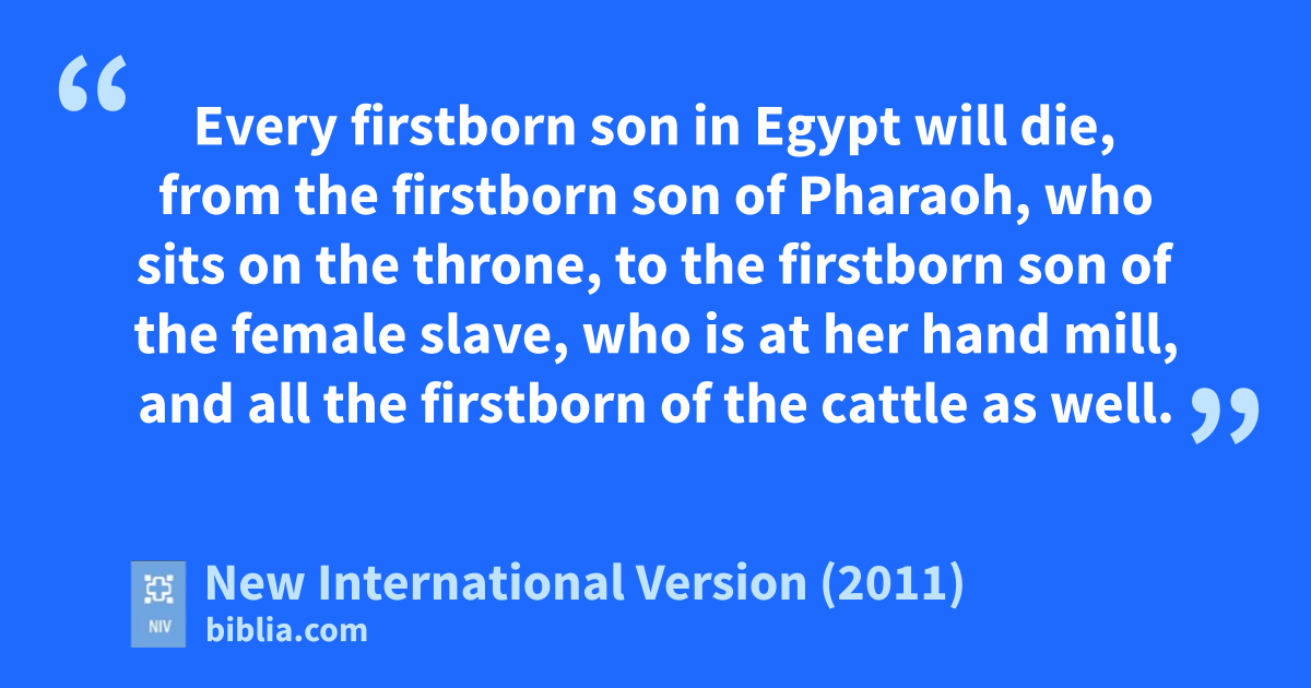 4 So Moses said, “This is what the Lord says: ‘About midnighth I will go throughout Egypt.i 5 Every firstbornj son in Egypt will die, from the firstborn son of Pharaoh, who sits on the throne, to the firstborn son of the female slave, who is at her hand mill,k and all the firstborn of the cattle as well. 6 There will be loud wailingl throughout Egypt—worse than there has ever been or ever will be again. 7 But among the Israelites not a dog will bark at any person or animal.’ Then you will know that the Lord makes a distinctionm between Egypt and Israel. 8 All these officials of yours will come to me, bowing down before me and saying, ‘Go,n you and all the people who follow you!’ After that I will leave.”o Then Moses, hot with anger, left Pharaoh.