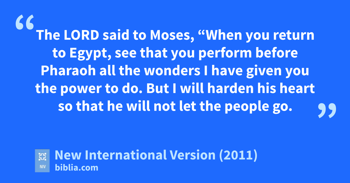 21 The Lord said to Moses, “When you return to Egypt, see that you perform before Pharaoh all the wondersr I have given you the power to do. But I will harden his hearts so that he will not let the people go.t 22 Then say to Pharaoh, ‘This is what the Lord says: Israel is my firstborn son,u 23 and I told you, “Let my son go,v so he may worshipw me.” But you refused to let him go; so I will kill your firstborn son.’ ”x