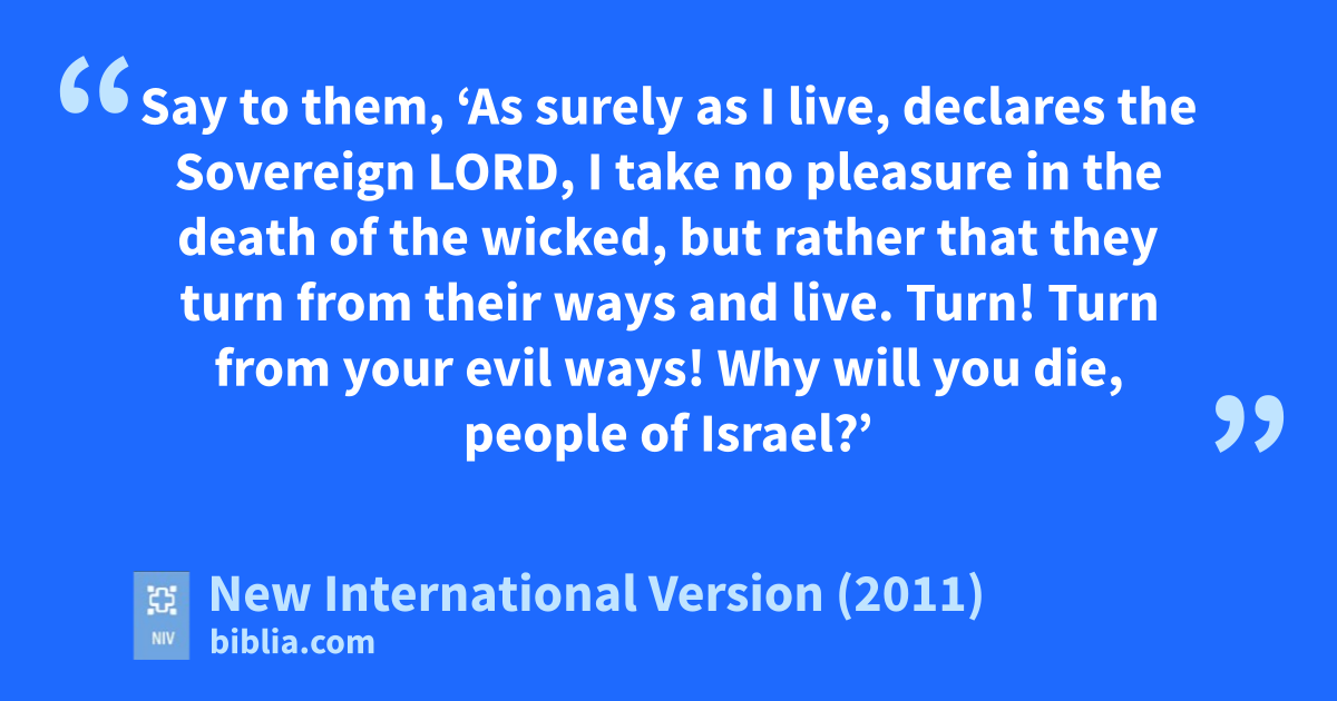 10 “Son of man, say to the Israelites, ‘This is what you are saying: “Our offenses and sins weigh us down, and we are wasting awayc because ofb them. How then can we live?d” ’ 11 Say to them, ‘As surely as I live, declares the Sovereign Lord, I take no pleasure in the death of the wicked, but rather that they turn from their ways and live.e Turn!f Turn from your evil ways! Why will you die, people of Israel?’g