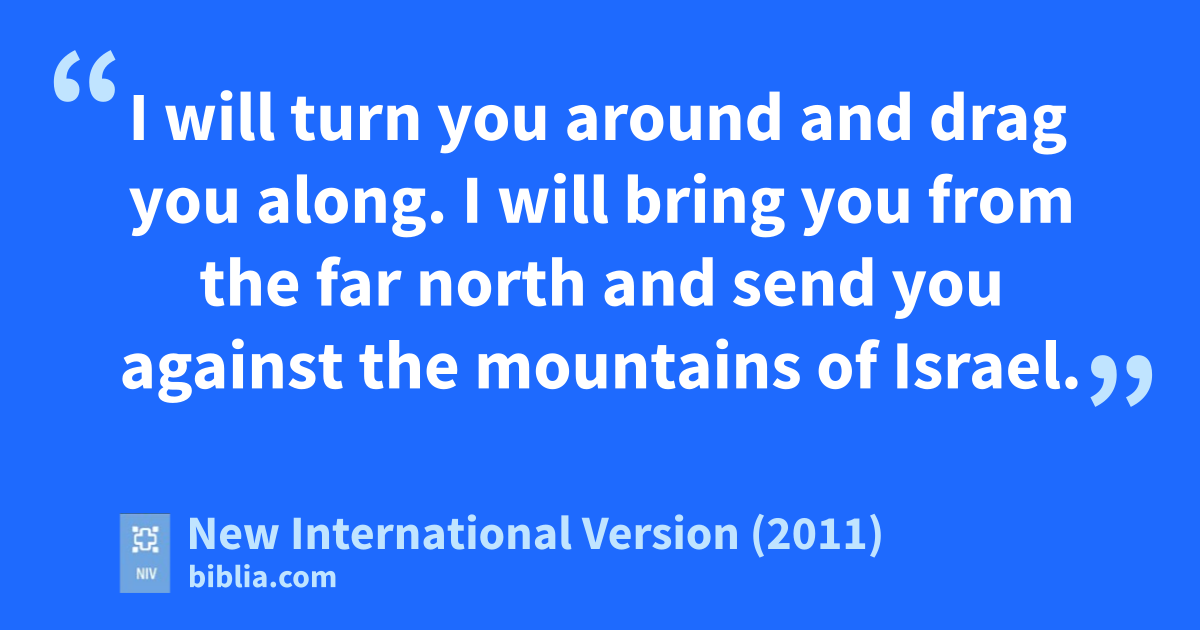 39 “Son of man, prophesy against Gogm and say: ‘This is what the Sovereign Lord says: I am against you, Gog, chief prince ofa Meshekn and Tubal.o 2 I will turn you around and drag you along. I will bring you from the far northp and send you against the mountains of Israel.q 3 Then I will strike your bowr from your left hand and make your arrowss drop from your right hand. 4 On the mountains of Israel you will fall, you and all your troops and the nations with you. I will give you as food to all kinds of carrion birdst and to the wild animals.u 5 You will fall in the open field, for I have spoken, declares the Sovereign Lord.v 6 I will send firew on Magogx and on those who live in safety in the coastlands,y and they will knowz that I am the Lord.