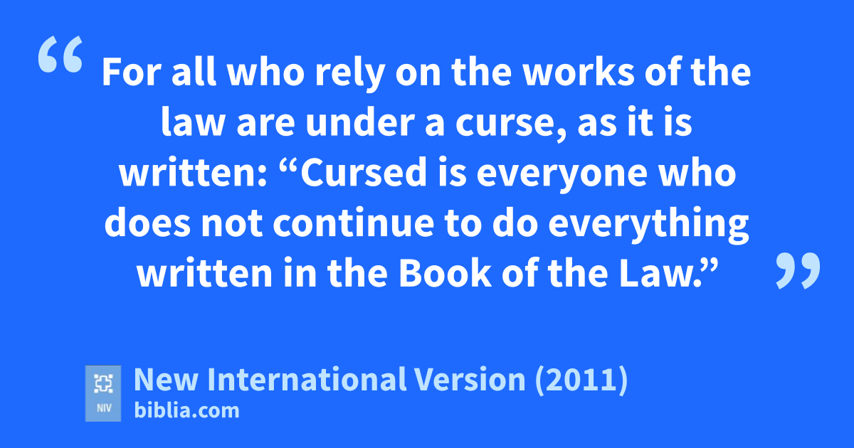 10 For all who rely on the works of the lawk are under a curse,l as it is written: “Cursed is everyone who does not continue to do everything written in the Book of the Law.”e m 11 Clearly no one who relies on the law is justified before God,n because “the righteous will live by faith.”f o 12 The law is not based on faith; on the contrary, it says, “The person who does these things will live by them.”g p 13 Christ redeemed us from the curse of the lawq by becoming a curse for us, for it is written: “Cursed is everyone who is hung on a pole.”h r 14 He redeemed us in order that the blessing given to Abraham might come to the Gentiles through Christ Jesus,s so that by faith we might receive the promise of the Spirit.t