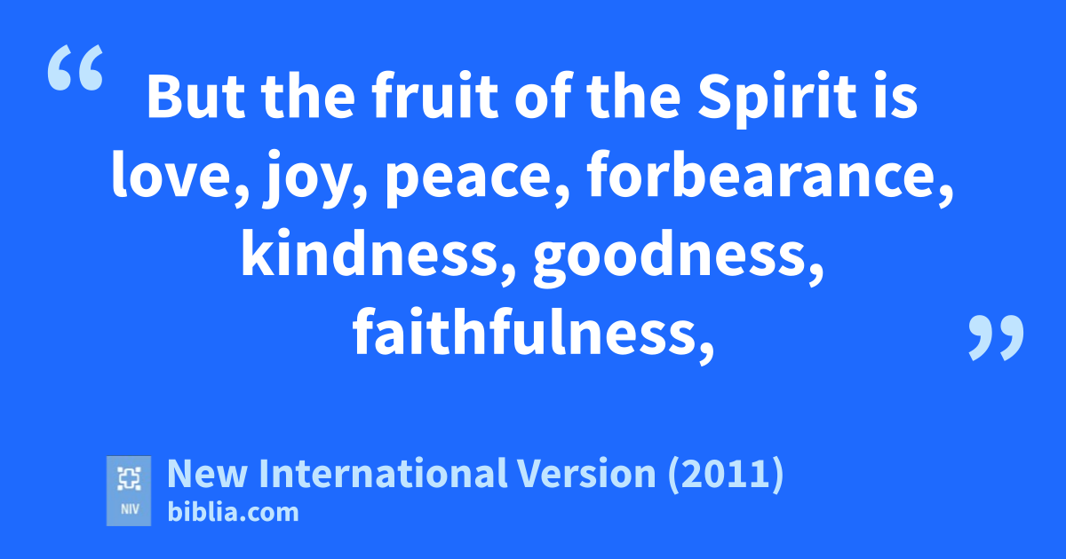 22 But the fruitu of the Spirit is love,v joy, peace,w forbearance, kindness, goodness, faithfulness, 23 gentleness and self-control.x Against such things there is no law.y 24 Those who belong to Christ Jesus have crucified the fleshz with its passions and desires.a 25 Since we live by the Spirit,b let us keep in step with the Spirit. 26 Let us not become conceited,c provoking and envying each other.
