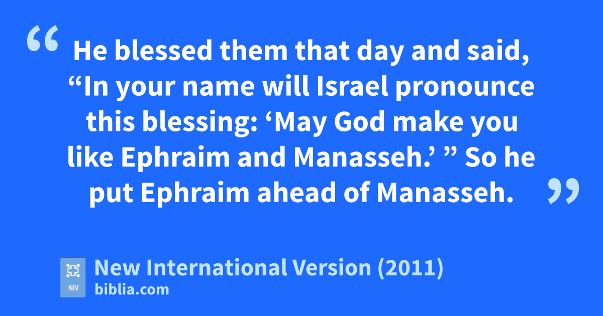 12 Then Joseph removed them from Israel’s kneeso and bowed down with his face to the ground.p 13 And Joseph took both of them, Ephraim on his right toward Israel’s left hand and Manasseh on his left toward Israel’s right hand,q and brought them close to him. 14 But Israelr reached out his right hand and put it on Ephraim’s head,s though he was the younger,t and crossing his arms, he put his left hand on Manasseh’s head, even though Manasseh was the firstborn.u