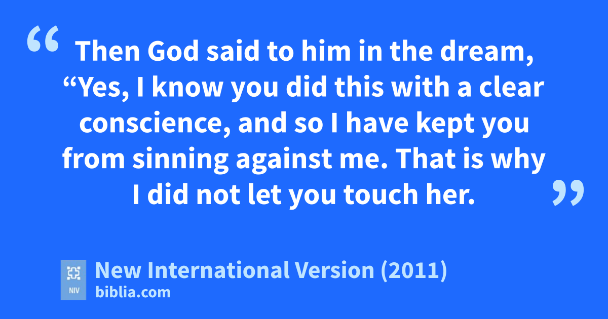 6 Then God said to him in the dream, “Yes, I know you did this with a clear conscience, and so I have keptl you from sinning against me.m That is why I did not let you touch her. 7 Now return the man’s wife, for he is a prophet,n and he will pray for youo and you will live. But if you do not return her, you may be sure that you and all who belong to you will die.”p