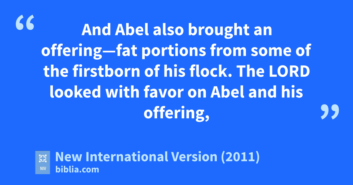 Now Abel kept flocks, and Cain worked the soil.d 3 In the course of time Cain brought some of the fruits of the soil as an offeringe to the Lord.f 4 And Abel also brought an offering—fat portionsg from some of the firstborn of his flock.h The Lord looked with favor on Abel and his offering,i 5 but on Cain and his offering he did not look with favor. So Cain was very angry, and his face was downcast.