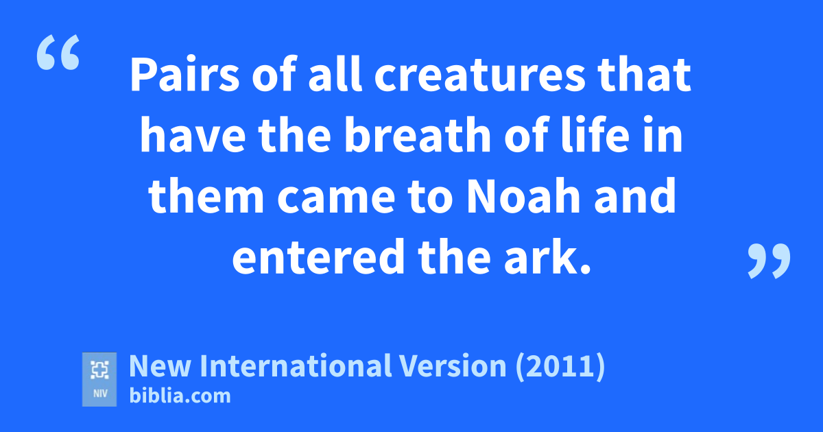13 On that very day Noah and his sons,z Shem, Ham and Japheth, together with his wife and the wives of his three sons, entered the ark.a 14 They had with them every wild animal according to its kind, all livestock according to their kinds, every creature that moves along the ground according to its kind and every bird according to its kind,b everything with wings. 15 Pairs of all creatures that have the breath of life in them came to Noah and entered the ark.c 16 The animals going in were male and female of every living thing, as God had commanded Noah.d Then the Lord shut him in.