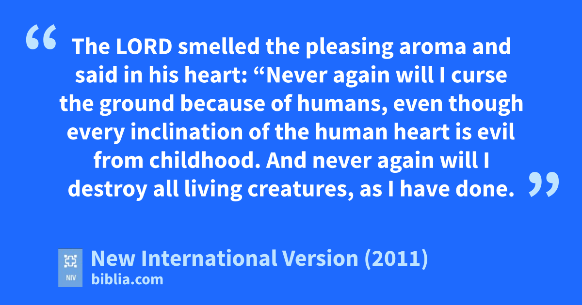 20 Then Noah built an altar to the Lorde and, taking some of all the clean animals and cleanf birds, he sacrificed burnt offeringsg on it. 21 The Lord smelled the pleasing aromah and said in his heart: “Never again will I curse the groundi because of humans, even thougha every inclination of the human heart is evil from childhood.j And never again will I destroyk all living creatures,l as I have done.