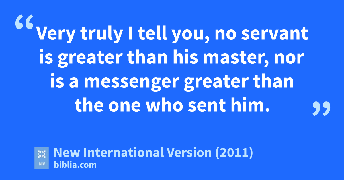 12 When he had finished washing their feet, he put on his clothes and returned to his place. “Do you understand what I have done for you?” he asked them. 13 “You call me ‘Teacher’h and ‘Lord,’i and rightly so, for that is what I am. 14 Now that I, your Lord and Teacher, have washed your feet, you also should wash one another’s feet.j 15 I have set you an example that you should do as I have done for you.k 16 Very truly I tell you, no servant is greater than his master,l nor is a messenger greater than the one who sent him. 17 Now that you know these things, you will be blessed if you do them.m