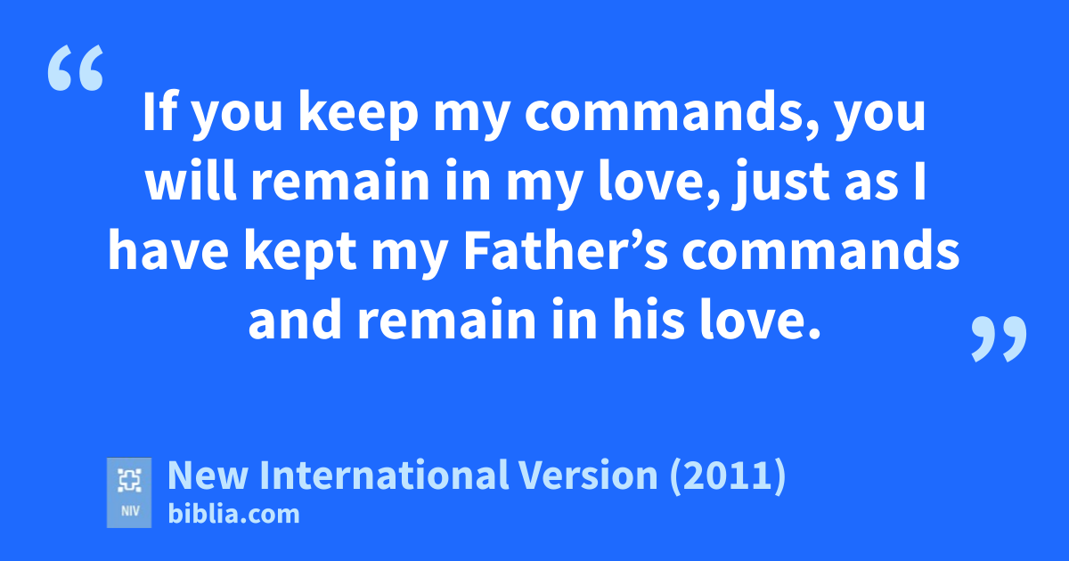 9 “As the Father has loved me,e so have I loved you. Now remain in my love. 10 If you keep my commands,f you will remain in my love, just as I have kept my Father’s commands and remain in his love. 11 I have told you this so that my joy may be in you and that your joy may be complete.g 12 My command is this: Love each other as I have loved you.h 13 Greater love has no one than this: to lay down one’s life for one’s friends.i 14 You are my friendsj if you do what I command.k 15 I no longer call you servants, because a servant does not know his master’s business. Instead, I have called you friends, for everything that I learned from my Father I have made known to you.l 16 You did not choose me, but I chose you and appointed youm so that you might go and bear fruitn—fruit that will last—and so that whatever you ask in my name the Father will give you.o 17 This is my command: Love each other.p
