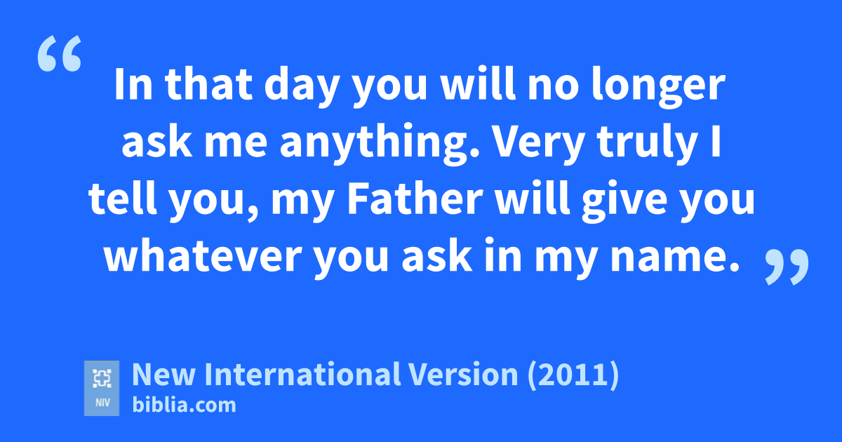 19 Jesus saw that they wanted to ask him about this, so he said to them, “Are you asking one another what I meant when I said, ‘In a little while you will see me no more, and then after a little while you will see me’? 20 Very truly I tell you, you will weep and mournh while the world rejoices. You will grieve, but your grief will turn to joy.i 21 A woman giving birth to a child has painj because her time has come; but when her baby is born she forgets the anguish because of her joy that a child is born into the world. 22 So with you: Now is your time of grief,k but I will see you againl and you will rejoice, and no one will take away your joy.m 23 In that dayn you will no longer ask me anything. Very truly I tell you, my Father will give you whatever you ask in my name.o 24 Until now you have not asked for anything in my name. Ask and you will receive,p and your joy will be complete.q