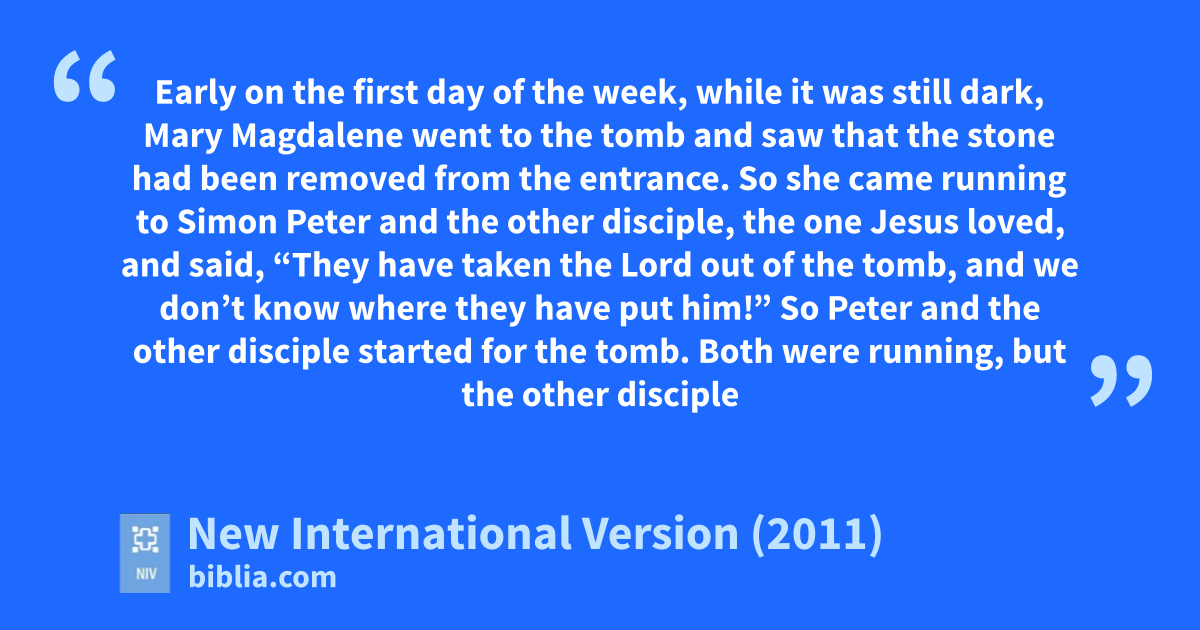 20 Early on the first day of the week, while it was still dark, Mary Magdalenef went to the tomb and saw that the stone had been removed from the entrance.g 2 So she came running to Simon Peter and the other disciple, the one Jesus loved,h and said, “They have taken the Lord out of the tomb, and we don’t know where they have put him!”i
