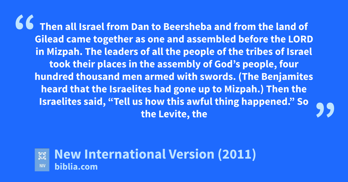 20 Then all Israelt from Dan to Beershebau and from the land of Gilead came together as onev and assembledw before the Lord in Mizpah.x 2 The leaders of all the people of the tribes of Israel took their places in the assembly of God’s people, four hundred thousand meny armed with swords. 3 (The Benjamites heard that the Israelites had gone up to Mizpah.) Then the Israelites said, “Tell us how this awful thing happened.”