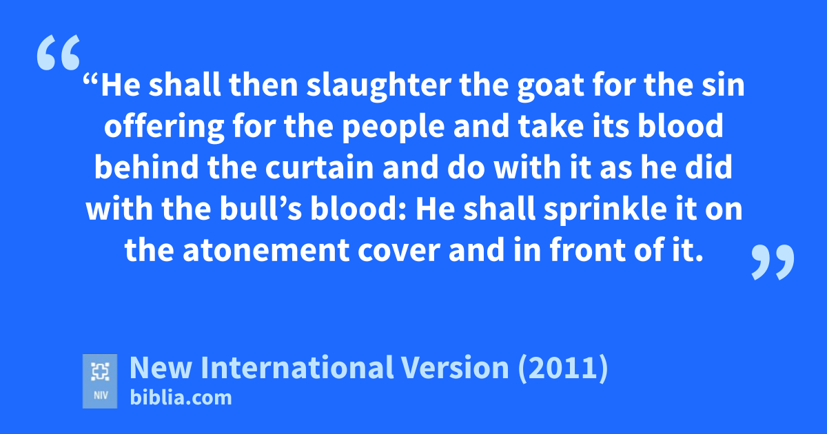 15 “He shall then slaughter the goat for the sin offering for the peopleb and take its blood behind the curtainc and do with it as he did with the bull’s blood: He shall sprinkled it on the atonement cover and in front of it. 16 In this way he will make atonemente for the Most Holy Placef because of the uncleanness and rebellion of the Israelites, whatever their sins have been. He is to do the same for the tent of meeting,g which is among them in the midst of their uncleanness. 17 No one is to be in the tent of meeting from the time Aaron goes in to make atonement in the Most Holy Place until he comes out, having made atonement for himself, his household and the whole community of Israel.