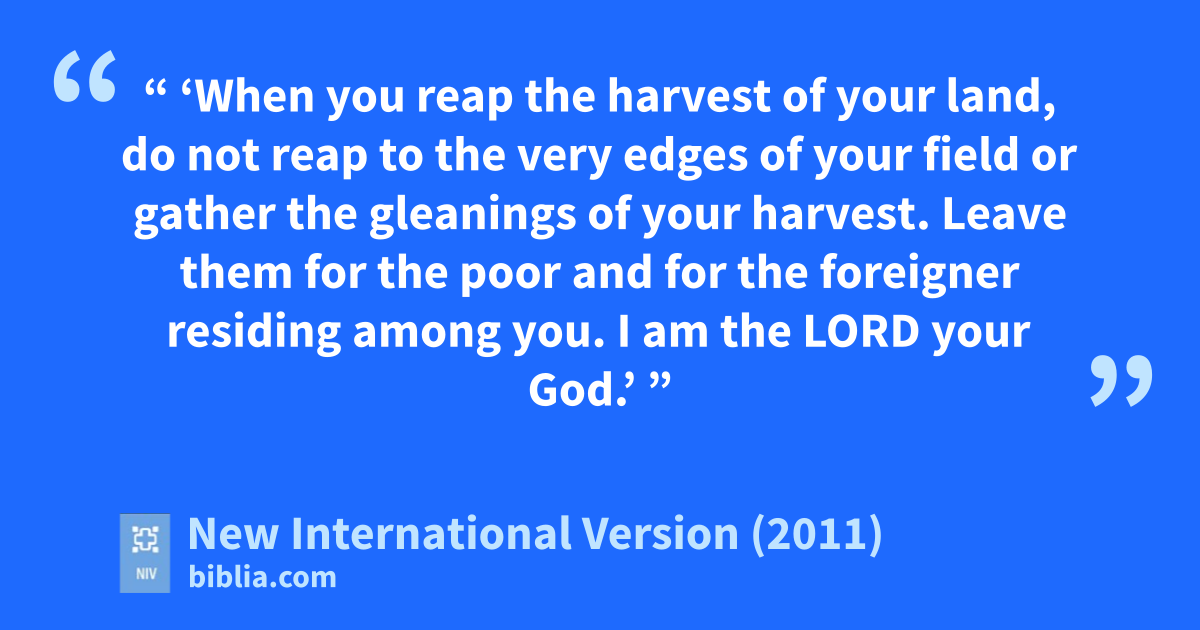 22 “ ‘When you reap the harvestj of your land, do not reap to the very edges of your field or gather the gleanings of your harvest.k Leave them for the poor and for the foreigner residing among you.l I am the Lord your God.’ ”