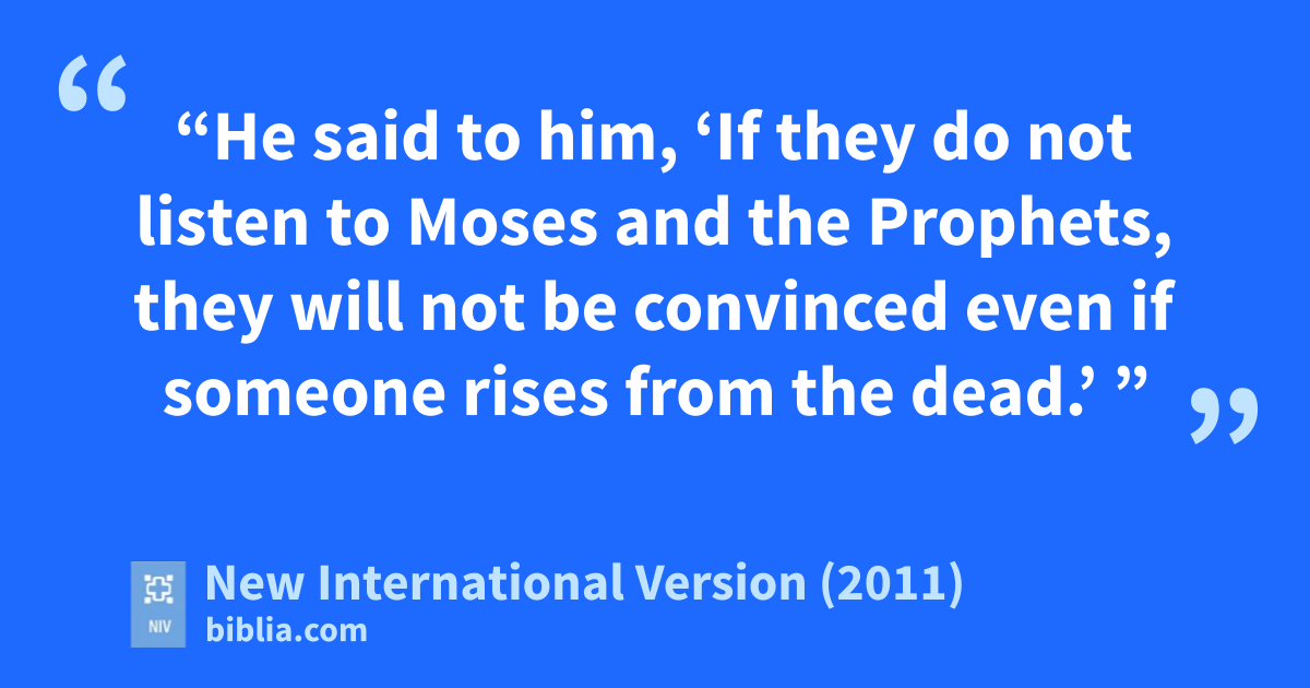 31 “He said to him, ‘If they do not listen to Moses and the Prophets, they will not be convinced even if someone rises from the dead.’ ”