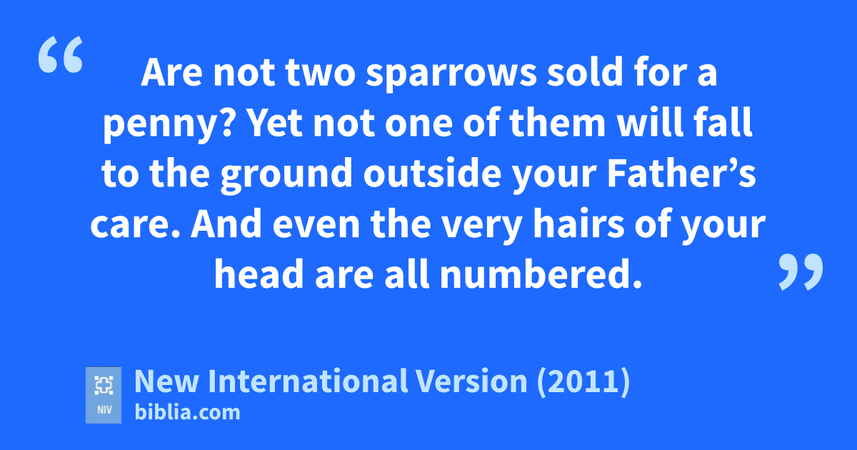 26 “So do not be afraid of them, for there is nothing concealed that will not be disclosed, or hidden that will not be made known.b 27 What I tell you in the dark, speak in the daylight; what is whispered in your ear, proclaim from the roofs. 28 Do not be afraid of those who kill the body but cannot kill the soul. Rather, be afraid of the Onec who can destroy both soul and body in hell. 29 Are not two sparrows sold for a penny? Yet not one of them will fall to the ground outside your Father’s care.b 30 And even the very hairs of your head are all numbered.d 31 So don’t be afraid; you are worth more than many sparrows.e