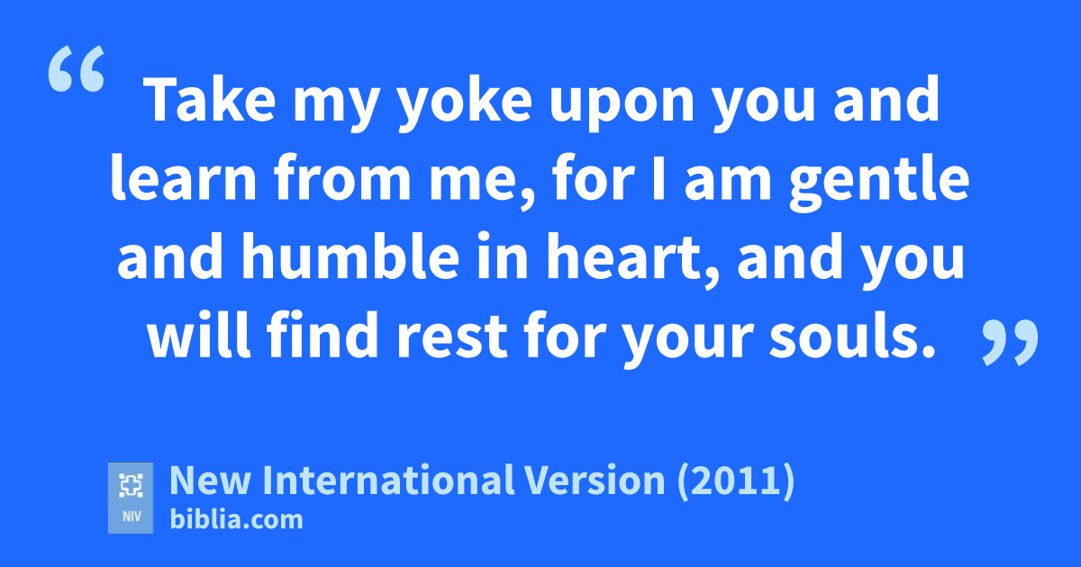 28 “Come to me,s all you who are weary and burdened, and I will give you rest.t 29 Take my yoke upon you and learn from me,u for I am gentle and humble in heart, and you will find rest for your souls.v 30 For my yoke is easy and my burden is light.”w