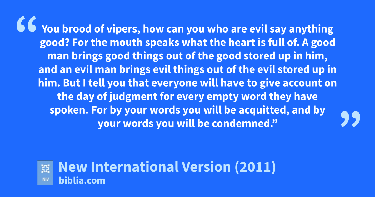 33 “Make a tree good and its fruit will be good, or make a tree bad and its fruit will be bad, for a tree is recognized by its fruit.d 34 You brood of vipers,e how can you who are evil say anything good? For the mouth speaksf what the heart is full of. 35 A good man brings good things out of the good stored up in him, and an evil man brings evil things out of the evil stored up in him. 36 But I tell you that everyone will have to give account on the day of judgment for every empty word they have spoken. 37 For by your words you will be acquitted, and by your words you will be condemned.”g