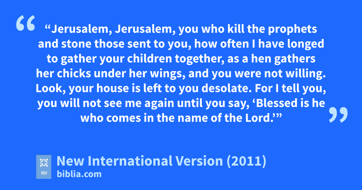 37 “Jerusalem, Jerusalem, you who kill the prophets and stone those sent to you,b how often I have longed to gather your children together, as a hen gathers her chicks under her wings,c and you were not willing. 38 Look, your house is left to you desolate.d 39 For I tell you, you will not see me again until you say, ‘Blessed is he who comes in the name of the Lord.’c”e
