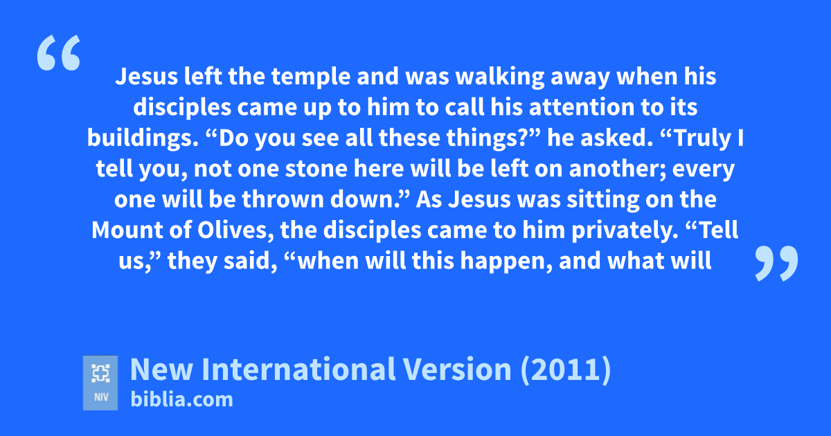 24 Jesus left the temple and was walking away when his disciples came up to him to call his attention to its buildings. 2 “Do you see all these things?” he asked. “Truly I tell you, not one stone here will be left on another;f every one will be thrown down.”
