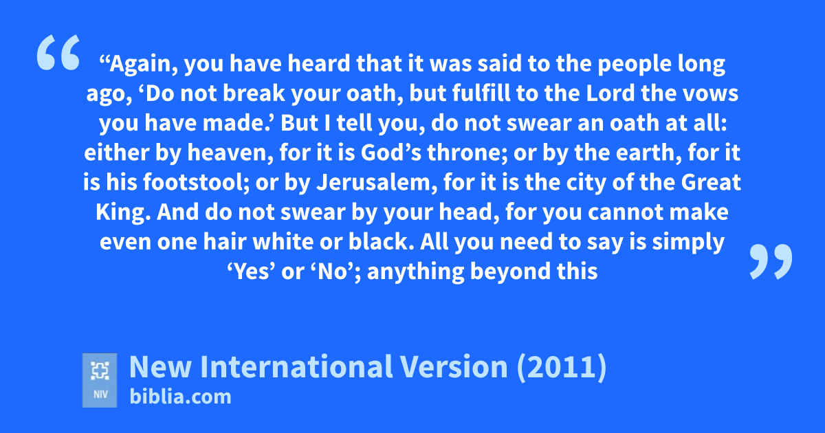 33 “Again, you have heard that it was said to the people long ago, ‘Do not break your oath,p but fulfill to the Lord the vows you have made.’q 34 But I tell you, do not swear an oath at all:r either by heaven, for it is God’s throne;s 35 or by the earth, for it is his footstool; or by Jerusalem, for it is the city of the Great King.t 36 And do not swear by your head, for you cannot make even one hair white or black. 37 All you need to say is simply ‘Yes’ or ‘No’;u anything beyond this comes from the evil one.g v