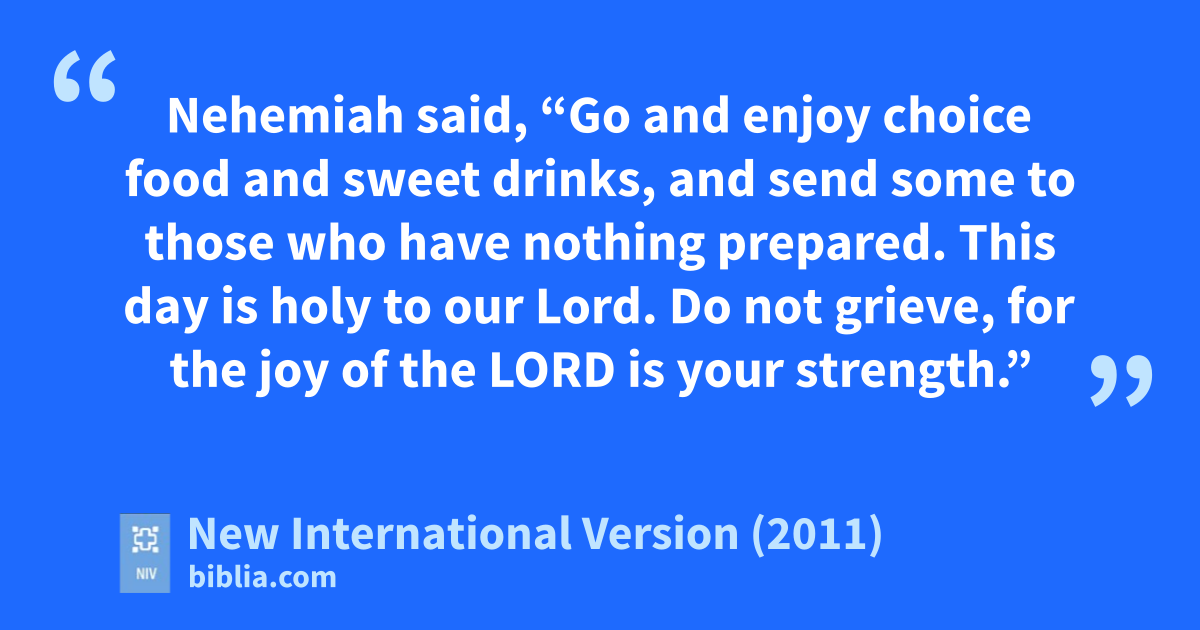 10 Nehemiah said, “Go and enjoy choice food and sweet drinks, and send some to those who have nothings prepared. This day is holy to our Lord. Do not grieve, for the joyt of the Lord is your strength.”