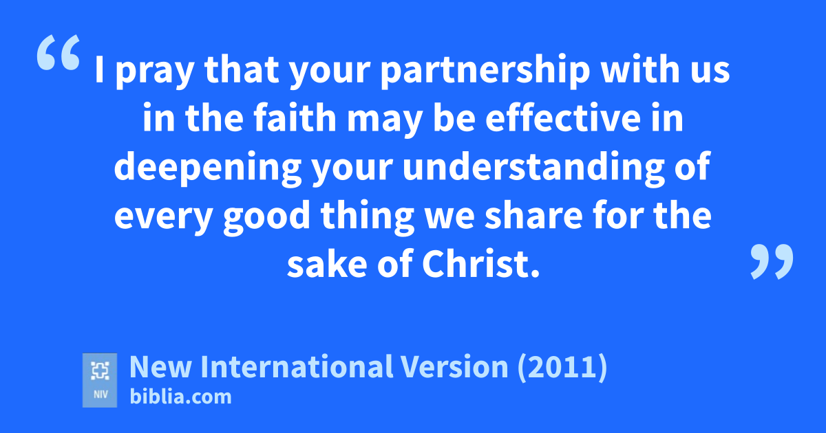 4 I always thank my Godi as I remember you in my prayers,j 5 because I hear about your love for all his holy peoplek and your faith in the Lord Jesus.l 6 I pray that your partnership with us in the faith may be effective in deepening your understanding of every good thing we share for the sake of Christ. 7 Your love has given me great joy and encouragement,m because you, brother, have refreshedn the hearts of the Lord’s people.