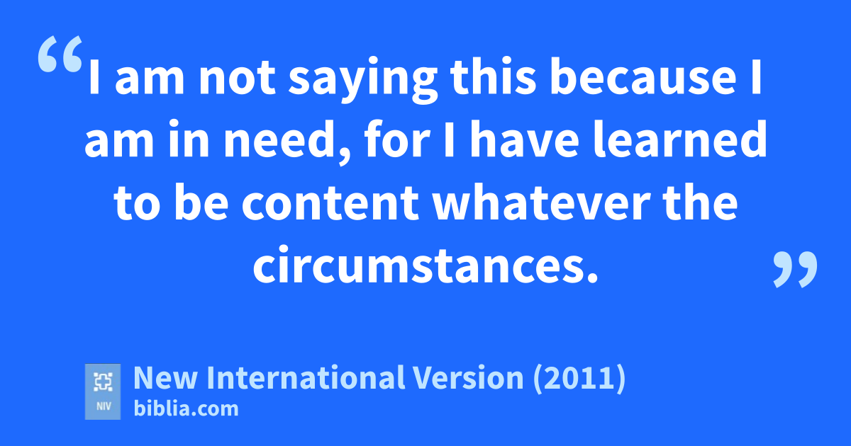 10 I rejoiced greatly in the Lord that at last you renewed your concern for me.w Indeed, you were concerned, but you had no opportunity to show it. 11 I am not saying this because I am in need, for I have learned to be contentx whatever the circumstances. 12 I know what it is to be in need, and I know what it is to have plenty. I have learned the secret of being content in any and every situation, whether well fed or hungry,y whether living in plenty or in want.z 13 I can do all this through him who gives me strength.a